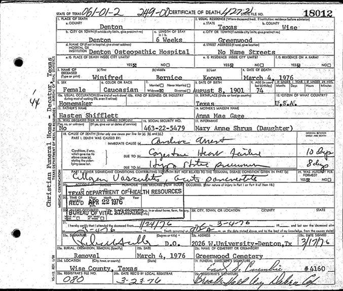 Co., VA, d. 03 Mar 1996 in Biloxi, Harrison Co., MS, Buried: Greeenoaks Memorial